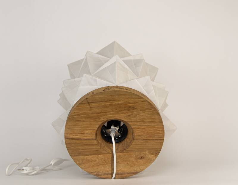 Nova kenmerkt zich door de duidelijk naar buiten staande, piramide vormige punten, 42 zijn het er in totaal. De lamp voet is vervaardigd uit massief eikenhout en behandeld met een hout olie. middels een klem fitting is de lichtbron gemakkelijk verwisselbaar.