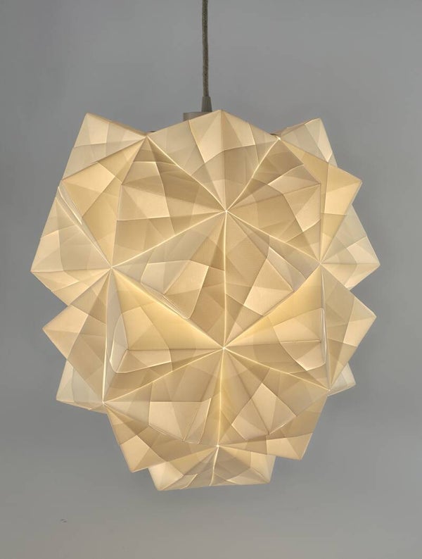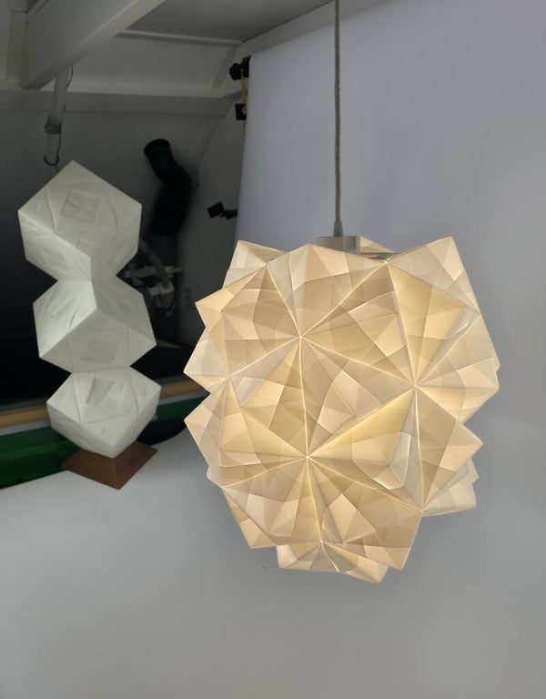 Opgebouwd uit 68 zorgvuldig gevouwen vellen semi-transparant papier krijgt deze geometrie een zachte aanwezigheid. Wanneer het licht aangaat, volgen de kleurnuances de richting van de vorm: van gelaagd en verspreid bovenin, naar intens en gefocust in het centrum.